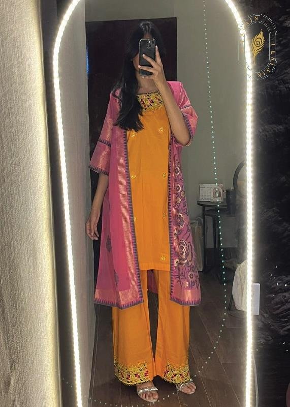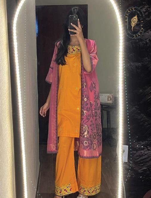 shirt with delicate Mukka work. The elegant design, paired with a pink upper, adds a luxurious and graceful touch, making it perfect for festive and special occasions.