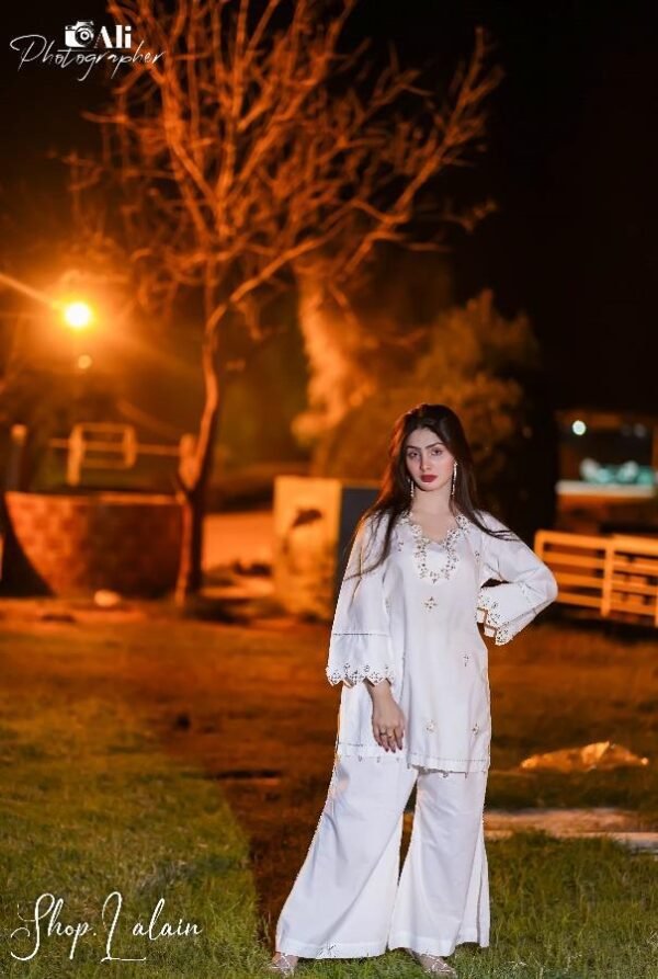 Embrace timeless elegance with the Seren ensemble – an elegant branded white short shirt paired with a matching palazzo, creating a look that exudes grace and serenity. The shirt is adorned with delicate handcrafted detailing, while the palazzo features subtle lace accents, adding a soft and sophisticated charm. Together, they form a perfect blend of elegance and purity.