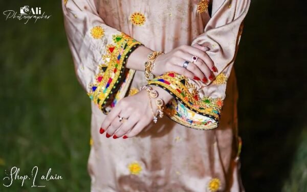Step into graceful elegance with the Sindhoo ensemble, a luxurious golden silk outfit featuring delicate Sindhi Maroori embroidery on the neckline, daman, and sleeves. Paired with a plain golden silk palazzo and a beautifully embroidered chiffon dupatta, this ensemble perfectly blends traditional craftsmanship with refined sophistication – ideal for festive and formal occasions.